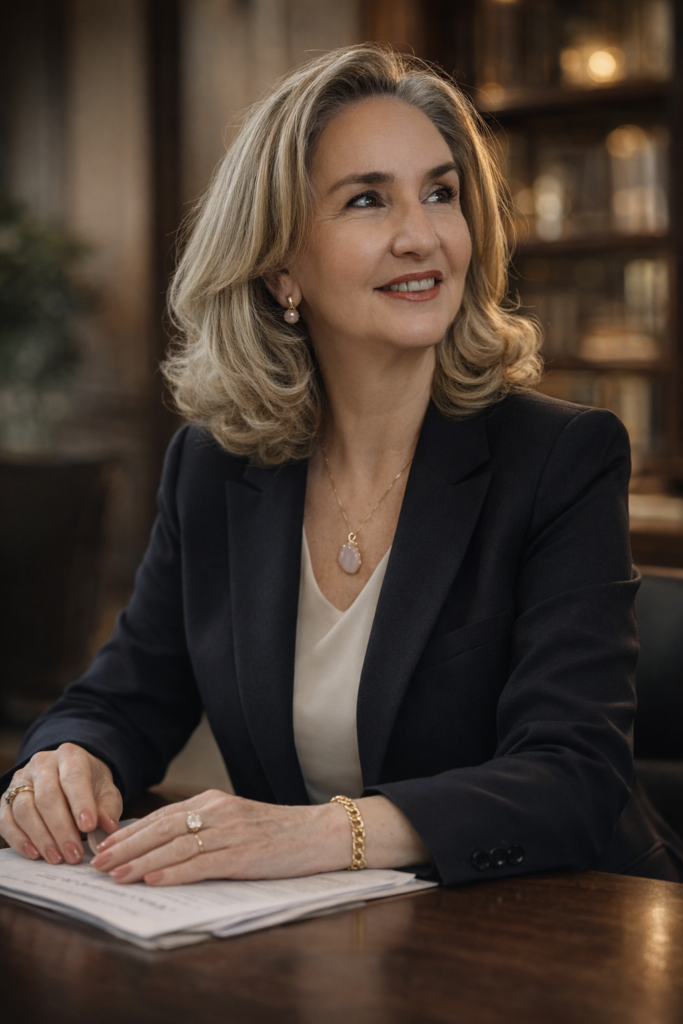 Composição profissional estilo fotografia executiva premium: mulher sentada em posição confiante, usando blazer escuro sofisticado, postura natural e expressão leve e segura. Fundo com estante e elementos de escritório desfocados, criando profundidade realista e atmosfera profissional contemporânea.