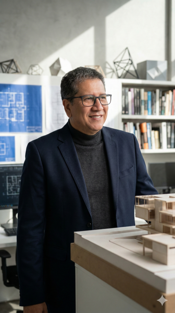 Transforme em um retrato de arquiteto mostrando visão de design e expertise técnica. O sujeito em traje profissional arquitetônico – blazer estruturado, gola rolê ou roupa profissional moderna refletindo sensibilidade de design. Expressão visionária e precisa – olhos inteligentes mostrando consciência espacial, sorriso confiante transmitindo competência técnica, comportamento pensativo refletindo o processo de design. Iluminação arquitetônica – linhas limpas, sombras interessantes sugerindo compreensão de espaço e luz. O fundo é um cenário arquitetônico – prédio moderno, estúdio de design com plantas e maquetes, elementos arquitetônicos interessantes, livros de design, profissionalmente desfocado. A composição segue princípios arquitetônicos – linhas limpas, equilíbrio geométrico, estrutura visual. A gradação de cores é estética arquitetônica – monocromática ou paleta limitada, tons modernos e limpos, cores apropriadas para arquiteto.