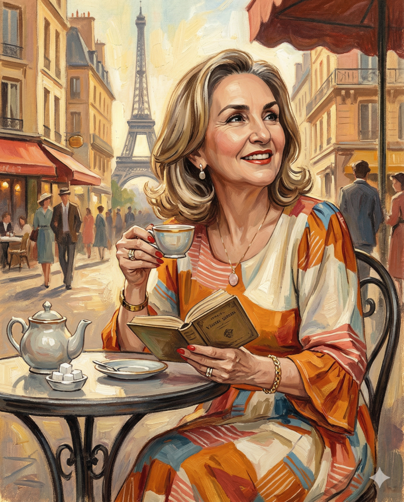 A pessoa está sentada num café em Paris, tomando chá e lendo um livro, olhando para o horizonte.