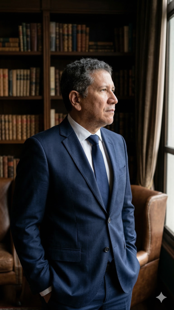 Estilo visual: fotografia ultra realista, estética GQ / Esquire / Forbes, composição profissional, enquadramento vertical 4:5, qualidade de campanha publicitária premium, realismo extremo (Realismo 333%), nitidez altíssima, textura de pele natural, micro imperfeições reais, cores sóbrias e sofisticadas, sensação de retrato atemporal, elegante, intelectual e aspiracional.
