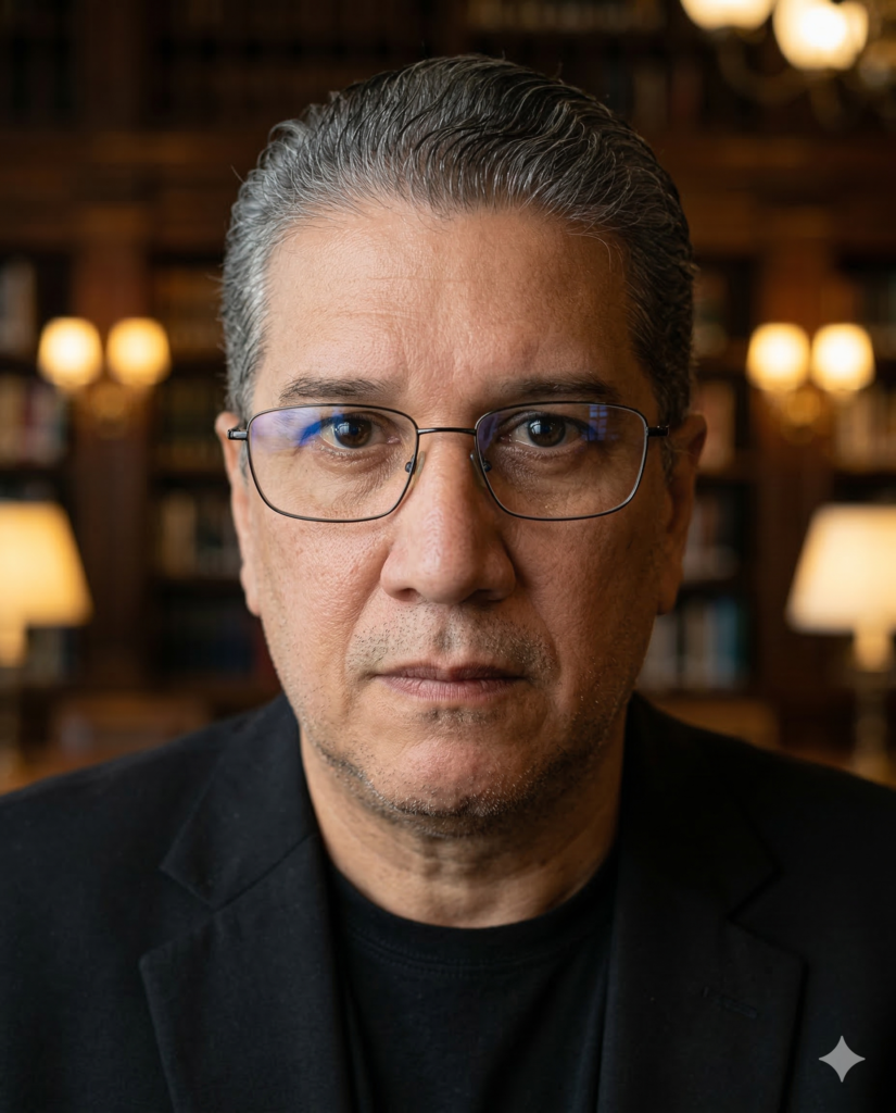 Cenário: biblioteca clássica ao fundo com estantes de livros em madeira escura, fundo levemente desfocado (bokeh natural), atmosfera intelectual, tons quentes e profundos.