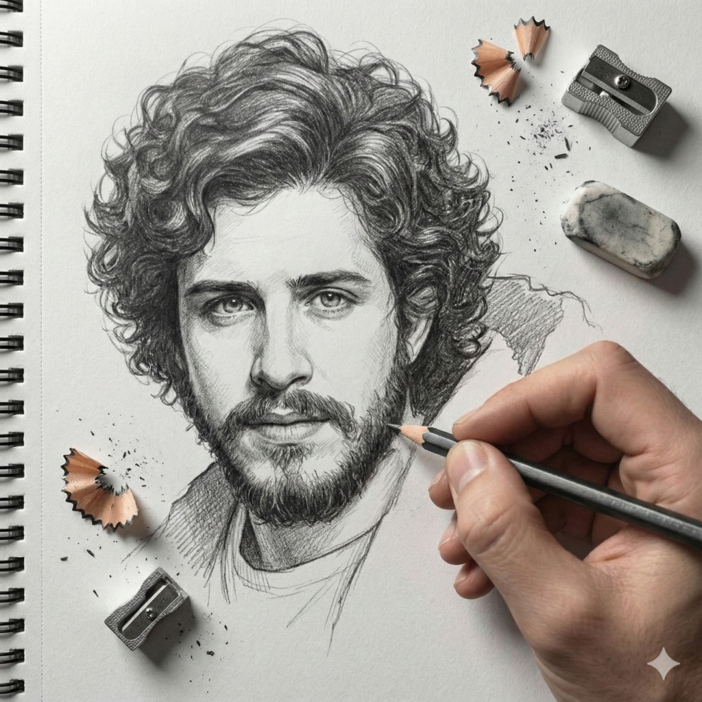 One hand is visible in the foreground holding a graphite pencil, actively sketching.