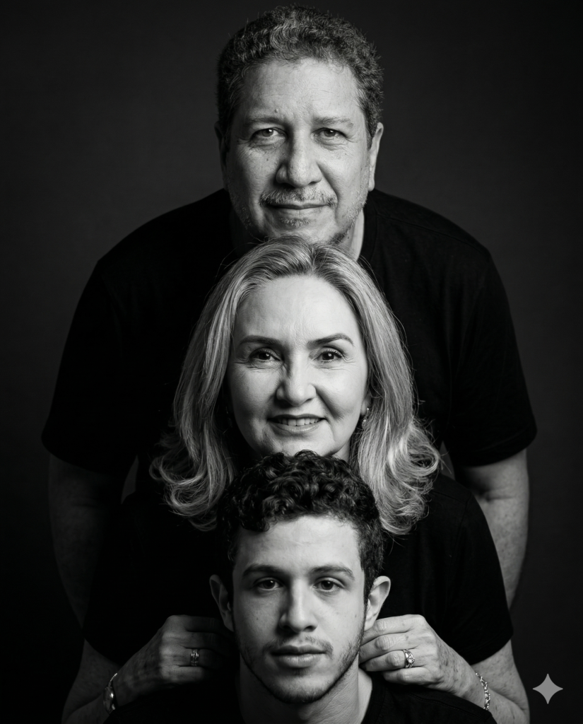 Use a imagem anexa como referência e mantenha 103% do rosto, a estrutura óssea e os traços distintivos de cada pessoa (pai, mãe e filho) iguais aos da imagem enviada.