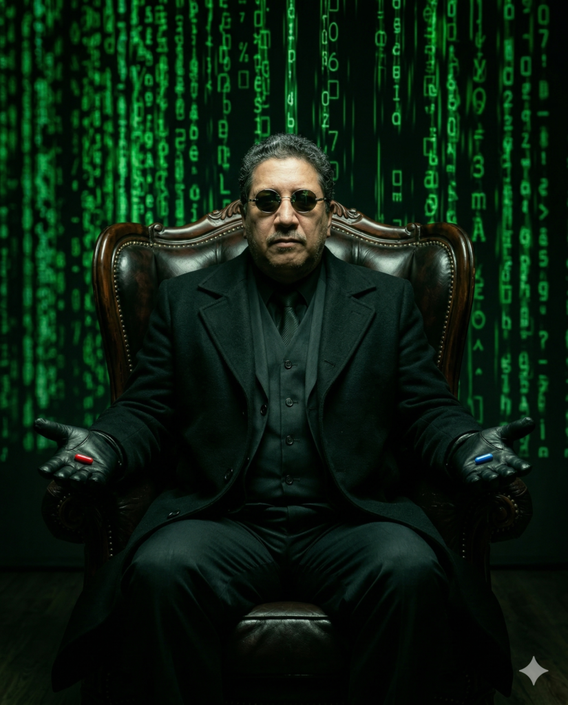 O fundo é escuro, quase um quarto estéril, mas visualmente dominado pelo código digital verde em cascata que simboliza uma realidade simulada. Esse código flui pelas paredes ou aparece como se fosse projetado, criando a sensação de estar dentro de um programa de computador.