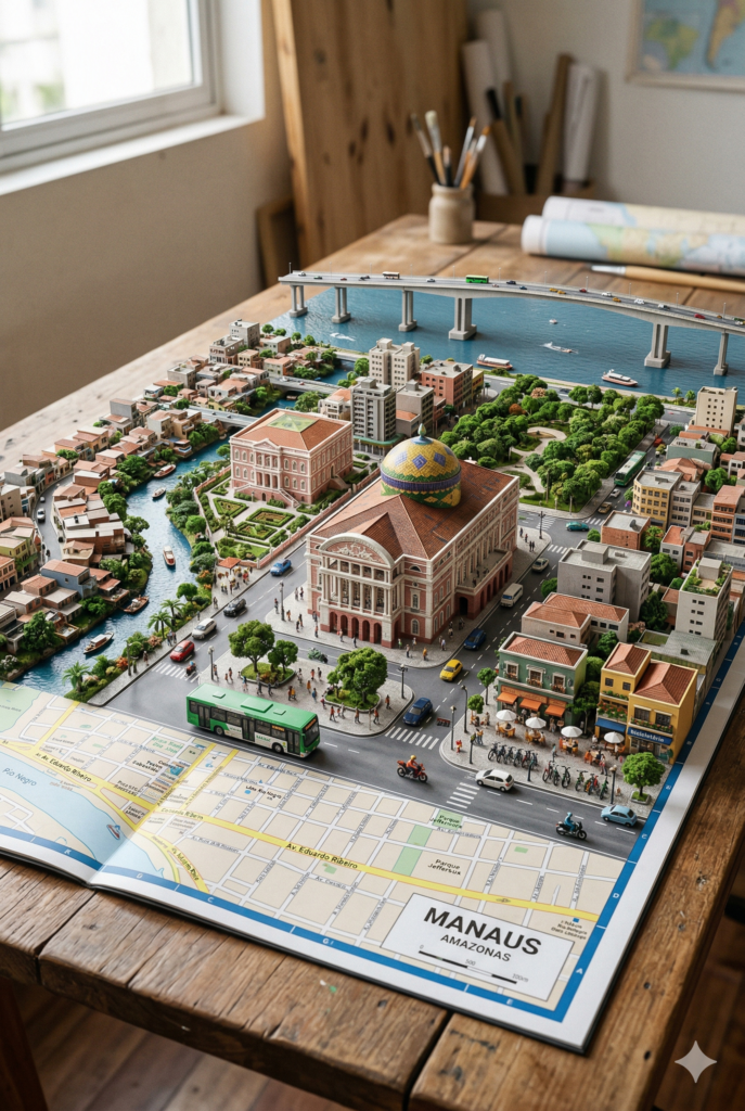 Um mapa de ruas de {NOME_DA_CIDADE} sobre {SUPERFÍCIE_DO_MAPA}, do qual surge uma miniatura fotorrealista da cidade em 3D. Nela, destacam-se {PONTO_TURÍSTICO_1}, {PONTO_TURÍSTICO_2}, {PONTO_TURÍSTICO_3}, {ELEMENTO_NATURAL}, {ELEMENTO_URBANO}, {TRANSPORTE_ICÔNICO} e {DETALHE_EXTRA}, todos crescendo a partir do mapa como em um diorama urbano detalhado. Iluminação suave de estúdio, profundidade cinematográfica, formato vertical 2:3.