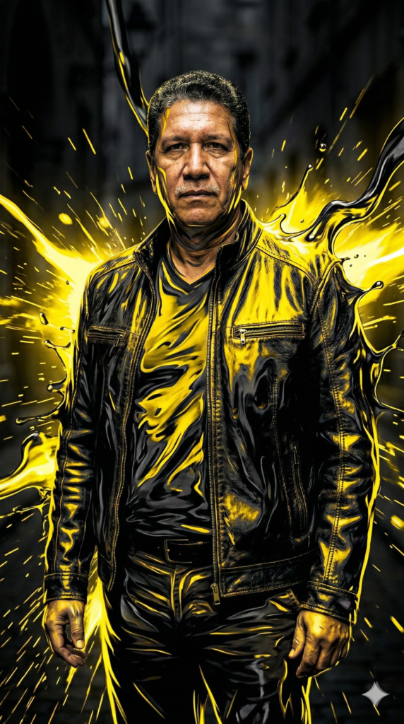 Gere uma imagem 9×16 do sujeito em anexo, no estilo de metal líquido, com efeitos de luz brilhantes, cenas de ação intensas, dimensões em múltiplas camadas, [amarelo] clara e preto escuro.