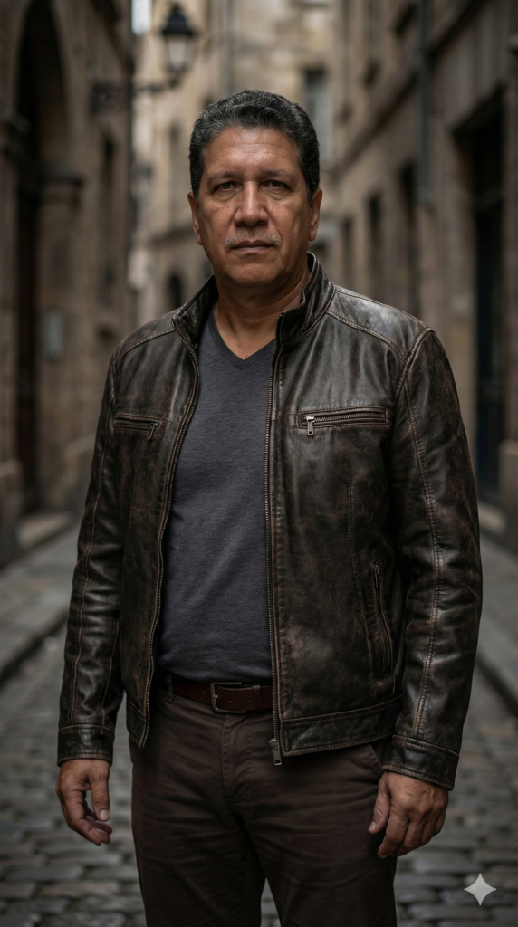 “Um retrato cinematográfico e fotorrealista de um homem. Use imagem enviada como referência. NÃO modifique seu rosto, olhos, nariz, boca, cabelo, formato do corpo. Não embeleze nem altere sua aparência. Ele veste uma jaqueta de couro marrom-escura, justa e com aspecto desgastado, estilo racer, com gola alta, textura aparente e bolsos com zíper. Por baixo, usa uma camiseta simples cinza-carvão com decote em V, por dentro de calças chino marrom-escuras, com um cinto de couro clássico. Ele está em um beco estreito e pouco iluminado, típico da Europa, com um fundo arquitetônico desfocado (bokeh). A iluminação é melancólica e direcional, projetando sombras suaves que enfatizam seus traços faciais e a textura desgastada do couro. Fotografia de alta moda, ultradetalhada e em resolução 8K, feita com lente de 50mm.”
