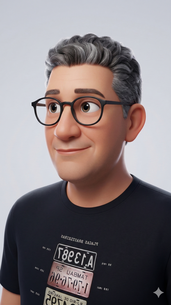 Use a imagem enviada como referência e gere um Retrato de personagem estilizado em 3D, usando óculos redondos pretos e uma camisa escura, expressão sorridente sutil enquanto olha para os lados, pele lisa, design de personagem de estilo Pixar altamente detalhado, iluminação de estúdio suave, fundo cinza claro limpo, ultra-nível, renderização cinematográfica, alto detalhe, estilo de filme animado moderno.