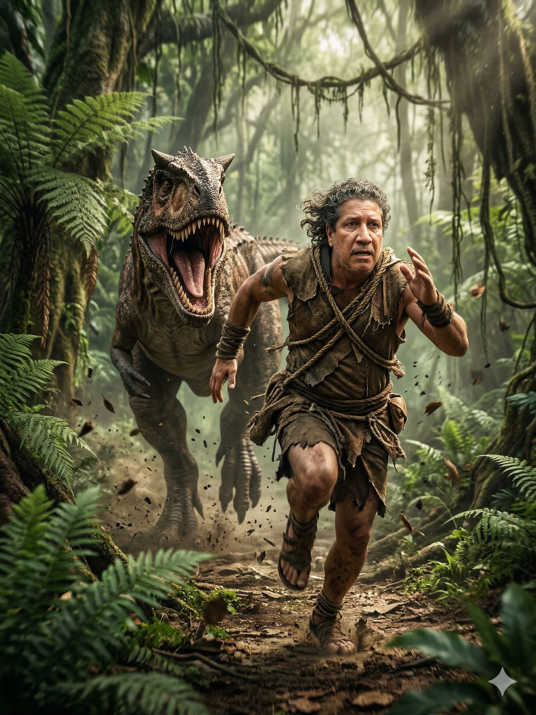 Conceito da cena: Uma perseguição de sobrevivência de alta intensidade em uma selva pré-histórica. O sujeito está em plena fuga, correndo a velocidade máxima por um terreno denso enquanto é ativamente perseguido por uma grande e agressiva criatura pré-histórica (um predador fictício semelhante a um dinossauro).