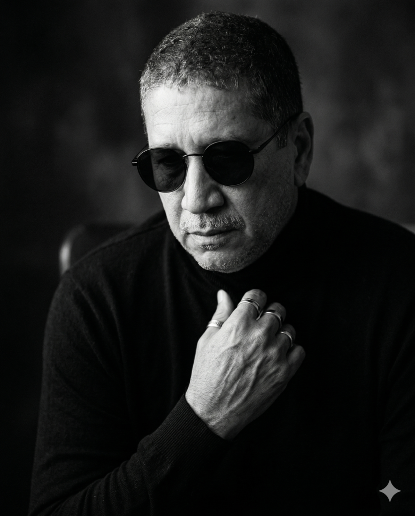 Retrato cinematográfico ultrarrealista em preto e branco 8K da pessoa da imagem de referência, em pose rígida: sentado com o corpo ligeiramente inclinado, ombros relaxados, cabeça levemente inclinada para baixo, olhos escondidos atrás de óculos de sol redondos e escuros, olhando para baixo com uma expressão calma e introspectiva. Uma das mãos levantada perto do peito, segurando levemente a manga ou a gola de um suéter preto de gola alta, dedos parcialmente visíveis com anéis. Iluminação suave e direcional vinda de um lado, criando sombras profundas e contraste melancólico, fundo escuro e desfocado, pouca profundidade de campo, lente de 50 mm, textura de pele hiperdetalhada, realces mínimos, atmosfera dramática de estúdio.