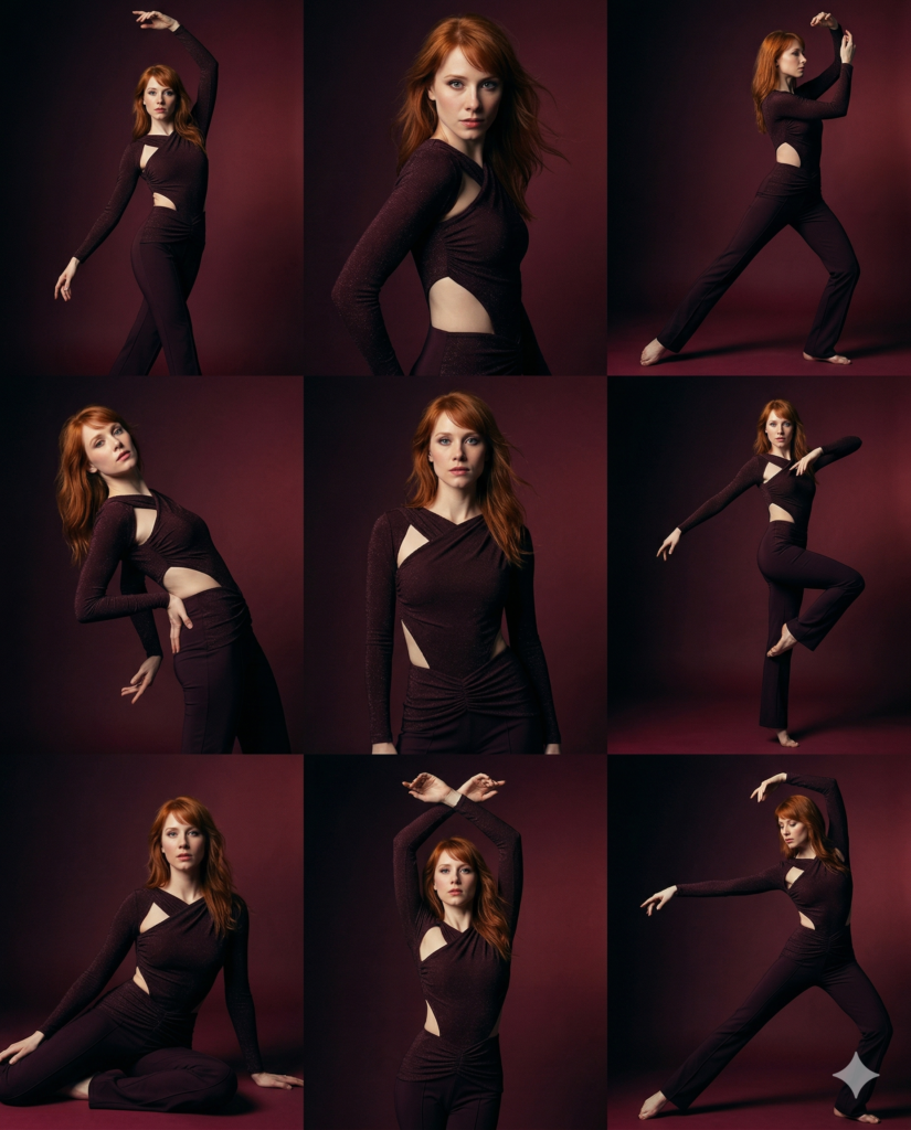 Cada pose deve parecer mais impactante, forte, elegante e inesquecível do que poses de dança comuns. Use linhas corporais longas e estendidas, curvas profundas no tronco, arquitetura dramática de braços, giros controlados, poses de poder sentadas, formas de moda fora de equilíbrio, linhas de pernas alongadas e presença de palco expressiva. O resultado deve parecer uma campanha coesa de dança de luxo com nove momentos poderosos do mesmo ensaio.