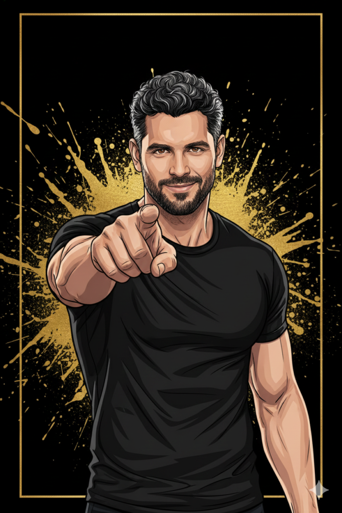 A high-quality digital illustration of a person pointing directly at the viewer; use the image as a reference, keeping 100% of the face visible. The person is wearing a tight black t-shirt. The art style is a mix of modern comics and vector illustration, with sharp lines and cinematic shading. In the background, there is a black background with splashes of gold ink and a thin square gold frame. Dramatic lighting, high contrast, and 8K resolution.