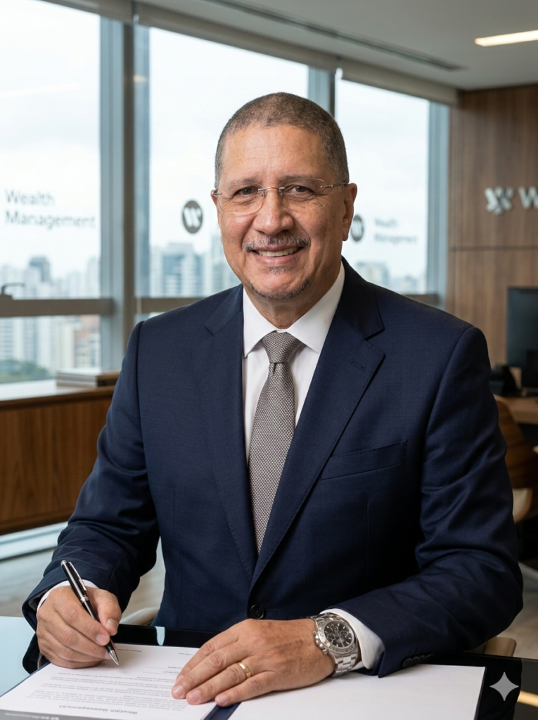 Transforme em um retrato de assessor que construa confiança e segurança imediatas. O sujeito em traje profissional conservador – terno de alta qualidade em azul-marinho ou grafite, gravata sutil ou blusa elegante, relógio caro sugerindo sucesso. Expressão confiável e competente – sorriso tranquilizador mostrando segurança financeira, olhos inteligentes transmitindo conhecimento de mercado, postura estável e confiante. Iluminação estável e autoritária – iluminação de estúdio profissional sugerindo confiabilidade e consistência. O fundo é um escritório financeiro sofisticado – interior moderno de empresa de gestão de patrimônio, vistas do distrito financeiro da cidade, móveis de escritório sofisticados, elegantemente desfocado. Composição financeiramente autoritária – enquadramento profissional formal, posicionamento confiável. A gradação de cores enfatiza a estabilidade – tons profissionais conservadores, cores que sugerem riqueza, paleta azul-cinza confiável.